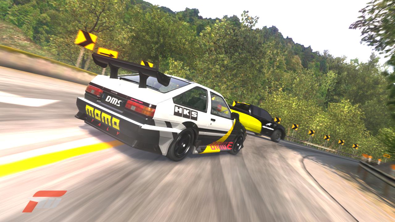 Fujimi Kaidon vuoristossa driftailee Toyota ja edestä älytön maasturi.
