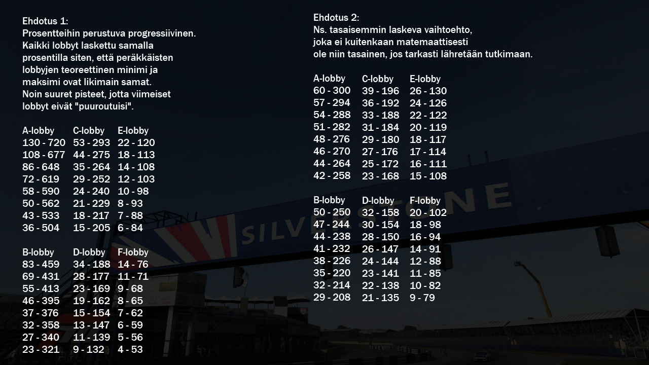 Molemmat nykyistä parempia! Mutta toi aikakisan pisteytys jaksaa kyllä mietityttää vielä, miksi esim B lobbyn nopein saa yhtä paljon pisteitä kuin A lobbyn neljäs.