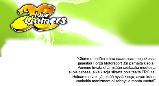 Lyhyt selvitys on varmaan paikalla. Eli me olemme manizmentissä lopen kyllästyneet järjestämään näitä sm-kisoja enää ensi kaudella. Ei millään saa enää tasavertaisia autoja, joilla olisi mukava ajaa. Siksipä olemme päättäneet ryhtyä yhteistyöhön Live Gamersin kanssa. Jatkossa he tulevat hoitamaan kisojen järjestelyn, ja pistelaskun, ja kaiken muun mitä mekin olemme tehneet tässä. Kuvaan liitimme mukaan tiedotteen, jonka Live Gamers julkaisee itsekkin myöhemmin. Mutta hyviä kisoja jatkossakin on luvassa!