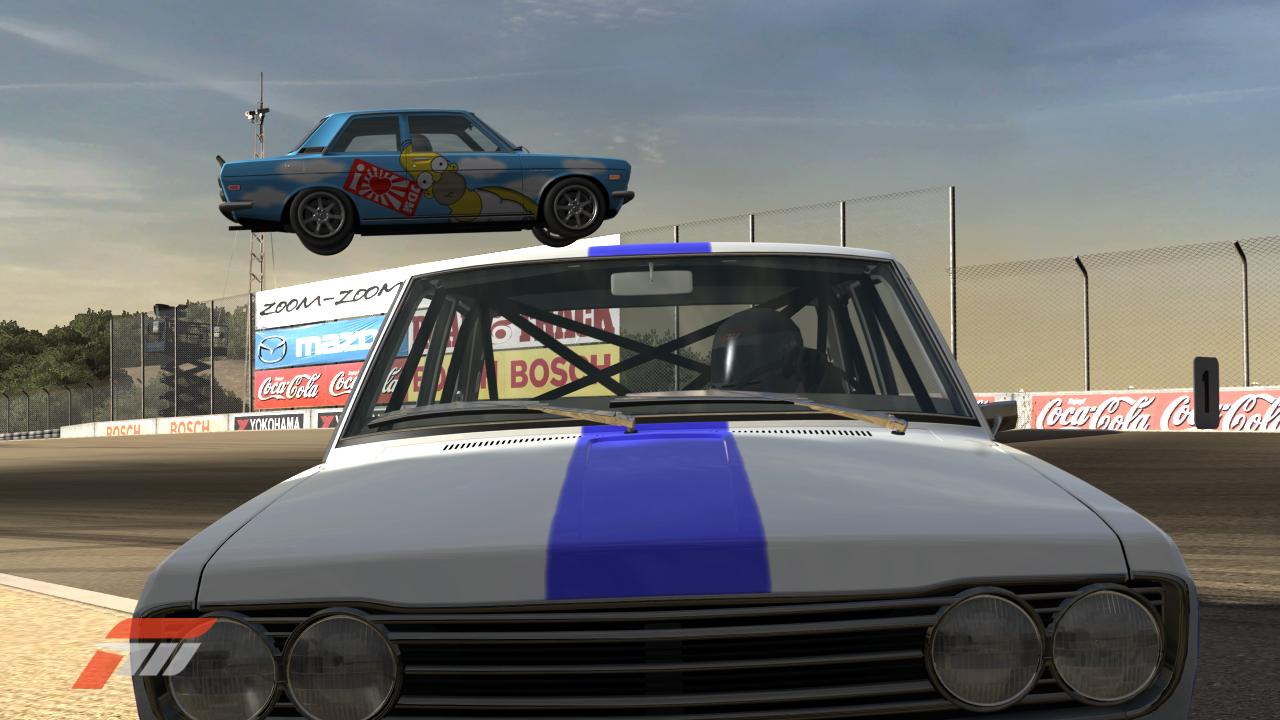 Se oli silloin tarkotuksena mutta kusahti siihen ku meni hermot kohan ja ilman saanin kohilleen saantiin. Jos tuo sininen raita ois kapeempi tai kokaan poissa näyttäis tuo homer datsuni varmaankin lisätyltä kuvaan