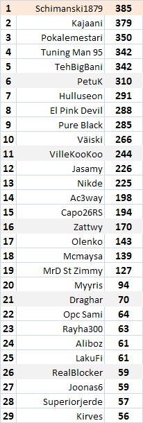 Mudinski wrote: Pientä taskurahaa ( FM creduja ) näytti Schimanski keräävän myös ! Onnittelut voittajalle ! Voittajan on helppo ryypätä !