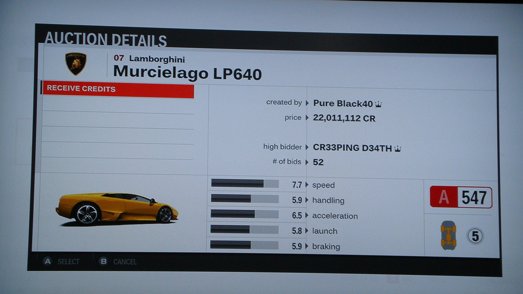 Voisiko joku antaa selityksen? Ostin tän rassin niihin LP640-kisoihin varten, ajoin ne, ja koska Garagen 'sell car' olisi antanut vain 150,000 CR päätin laittaa auton sillä hinnalla AH:seen. Auto on täysin vakio, eikä sitä ole maalattu kertaakaan, ja tässä on lopputulos...