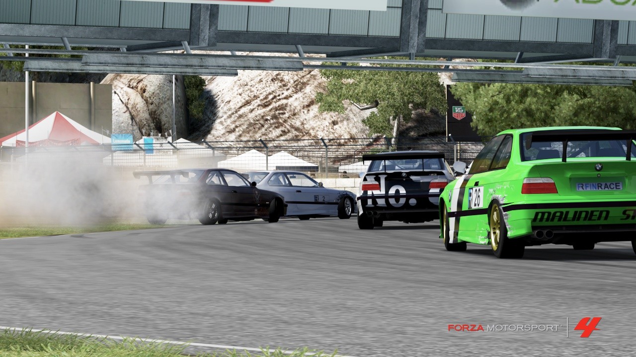 FinRace Extreme BMW, välillä vähä tapahtuuki, ja käydään nurmenpuolella nostattamassa likaa radalle.