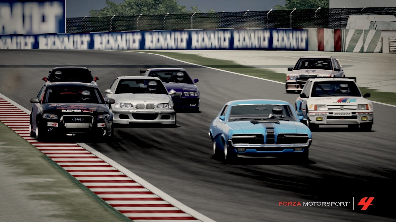 Ekassa mutkassa Mersu, audi, ja valkonen bemari vähän kolisteli, audi tippu jossain välissä hännille, niin että koukkari ja pökö (ainakin) sai sen kiinni, Hondan lopputulosta en suoralta kädeltä muista mutta muuten mentiinkin sitte aika tarkkaan kuvan osoittamassa järjestyksessä. Rata oli catalonia mini (tjsp) ja tais muutama saksalainen ihmetellä ku muskeli jyrää syheröllä missä sai tasan kerran avattuu kaasun pohjaan asti.
