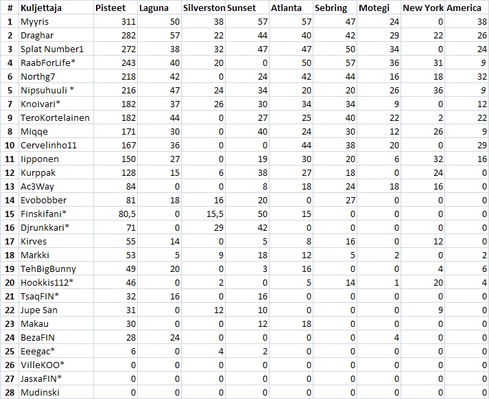 // Tähdellä merkityt on 'Rookieita' :)