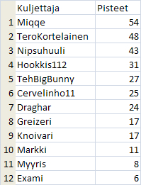 Onnittelut voittajalle vielä täältäkin päin! Jäi kyllä tosi paljon harmittamaan omat kämmit tuolla Nyrrellä, kun molemmissa kisoissa kävin kolistelemassa seiniä. Mutta tämmöistä se "motorsportti" tuppaa välillä olemaan, kun yrittää ajaa kovempaa kuin mihin taidot riittää.