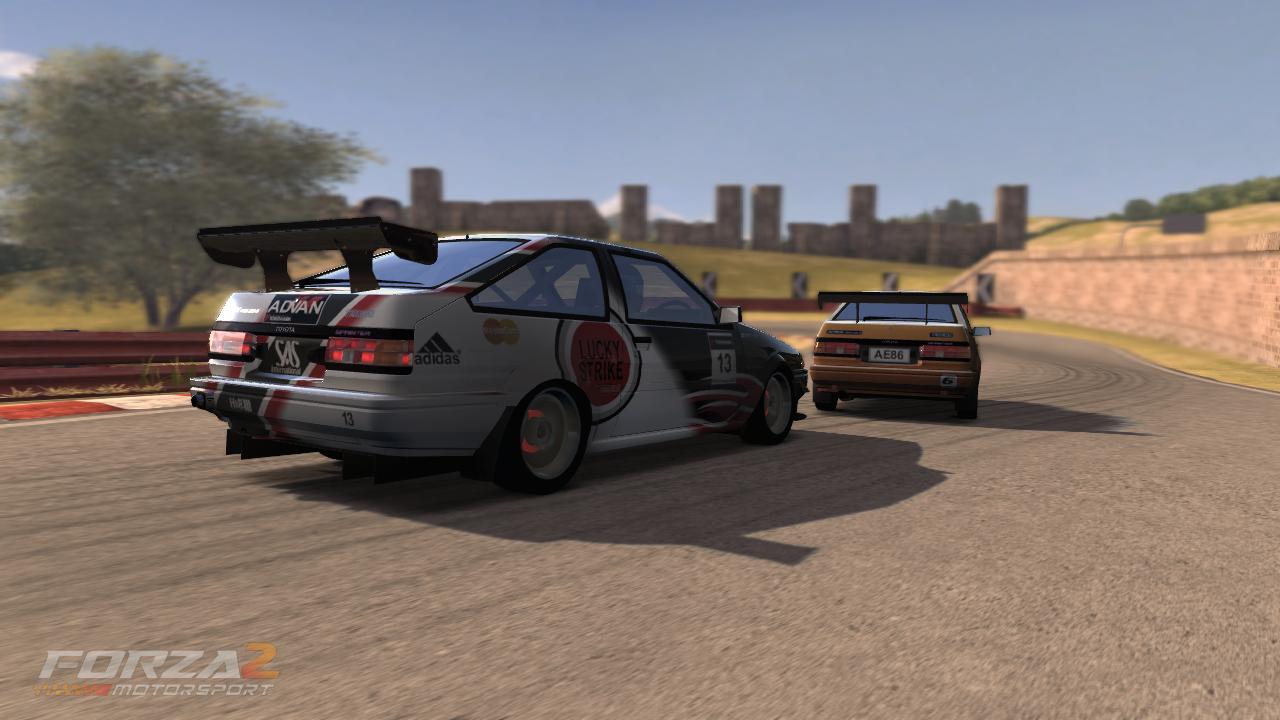Kisan alkupuolella AE86 kaksikko pysyi puolen sekunnin sisällä muutaman kierroksen ajan. Välillä oli tiukkaa. Kuvassa Ariko ja oranssilla Truenolla Revengeant. Arikon AE86 oli rakennettu mutkateille, Revengeatilla oli enemmän tehoa.
